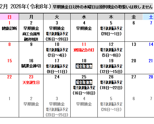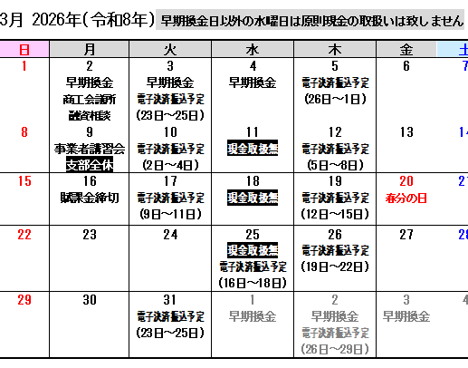 祝休日に伴い電子決済振込予定日が下記の通り変更になります。